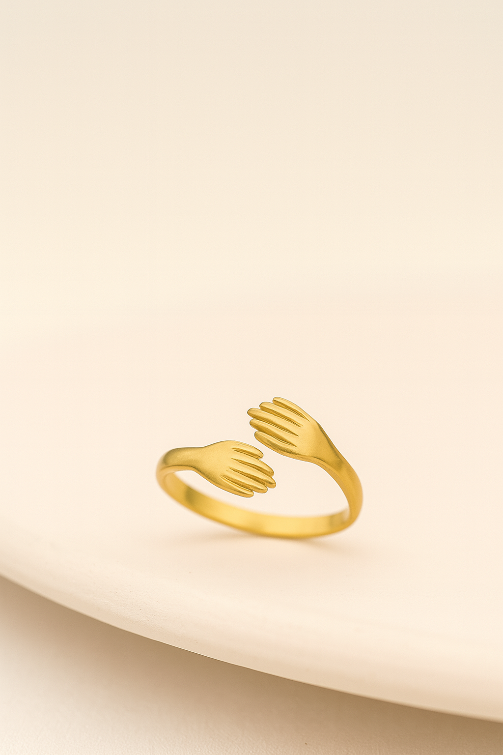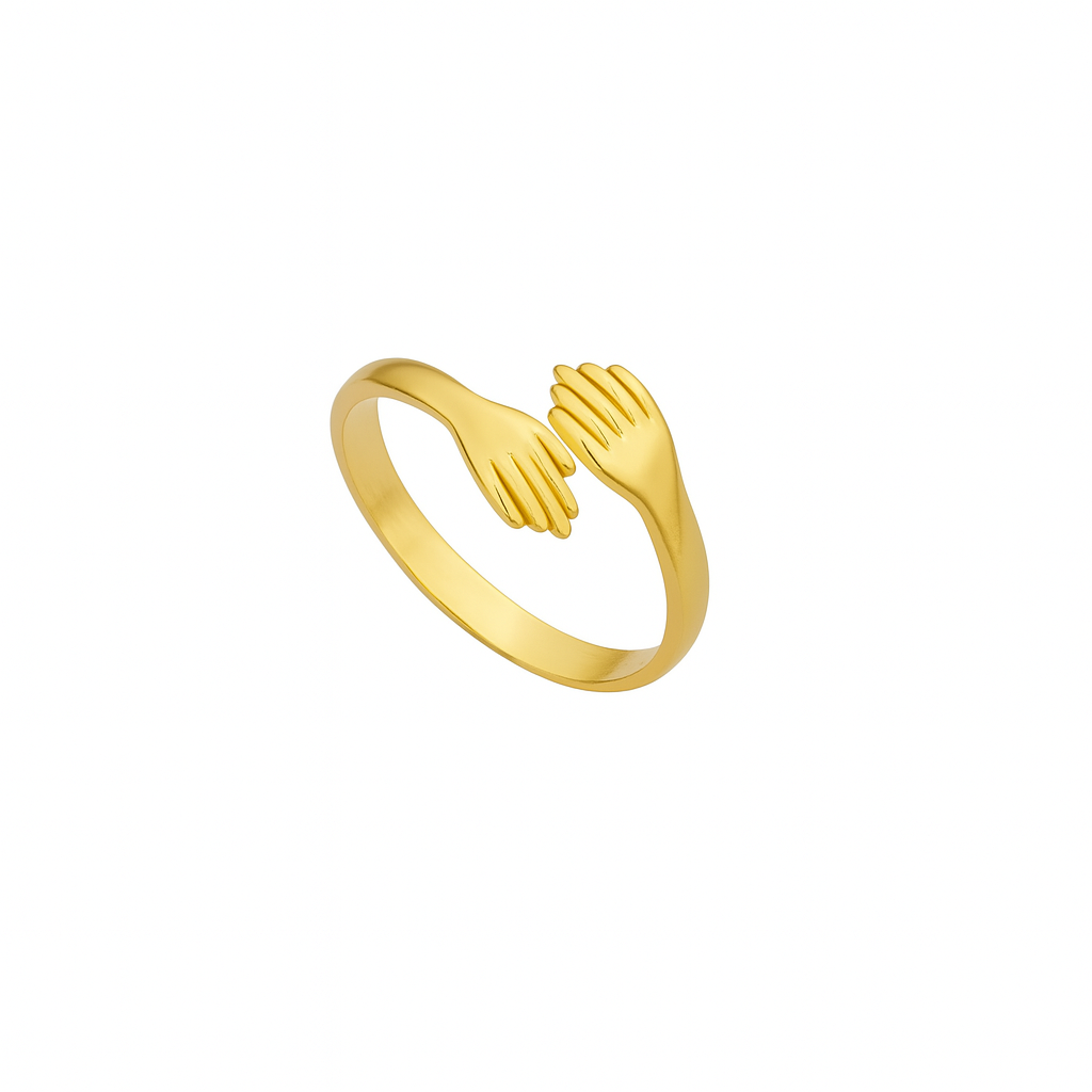 Delicate yet powerful, the Hold Me Close Ring features two sculpted hands gently reaching toward each other — a poetic symbol of connection, comfort, and love. Crafted in a matte gold finish, this ring wraps around your finger like a soft embrace.