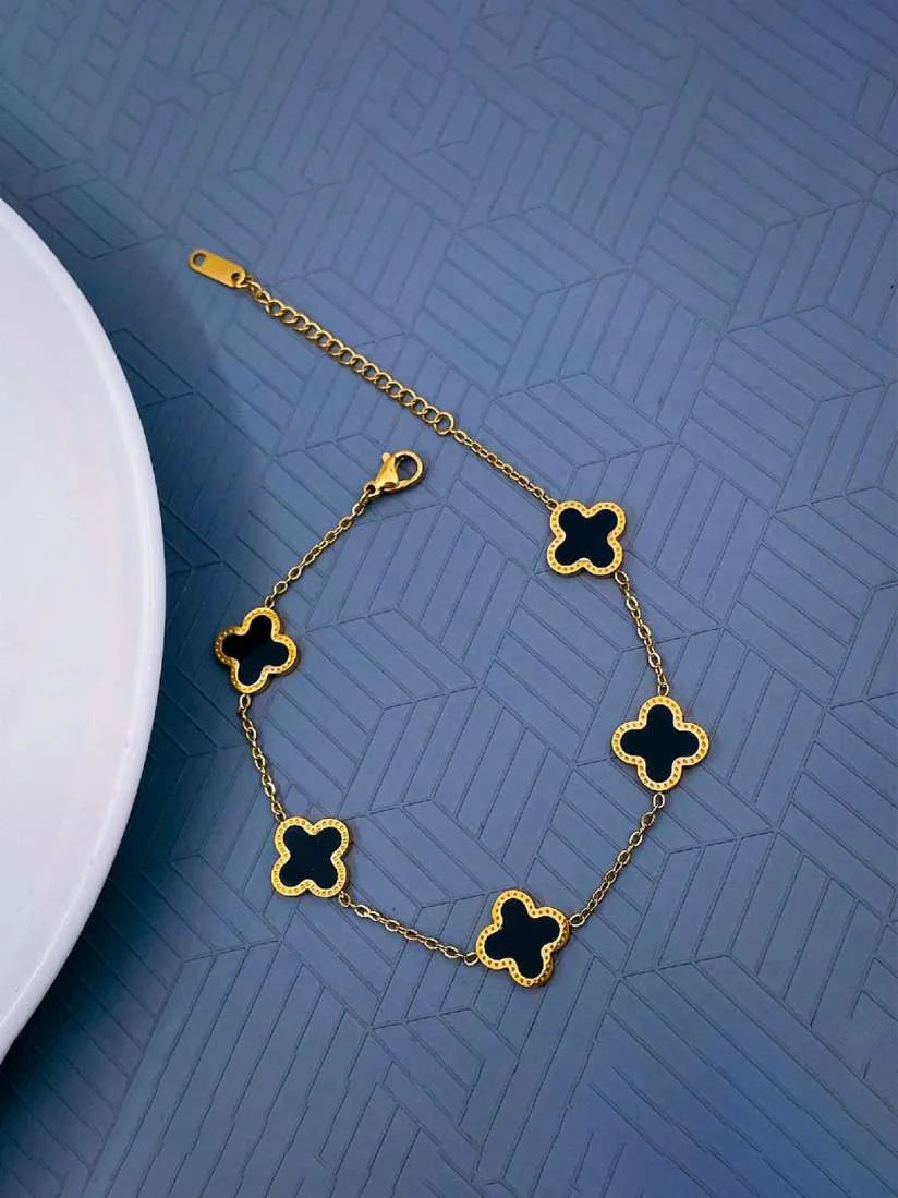 Black floral bracelet with five clover-shaped charms for a modern statement