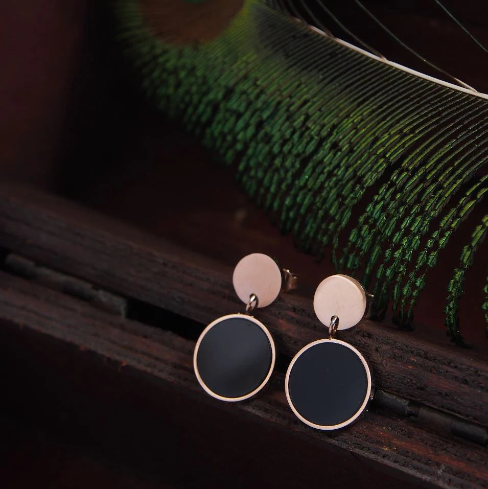 Stylish black drop earrings with glossy enamel and rose gold-tone border