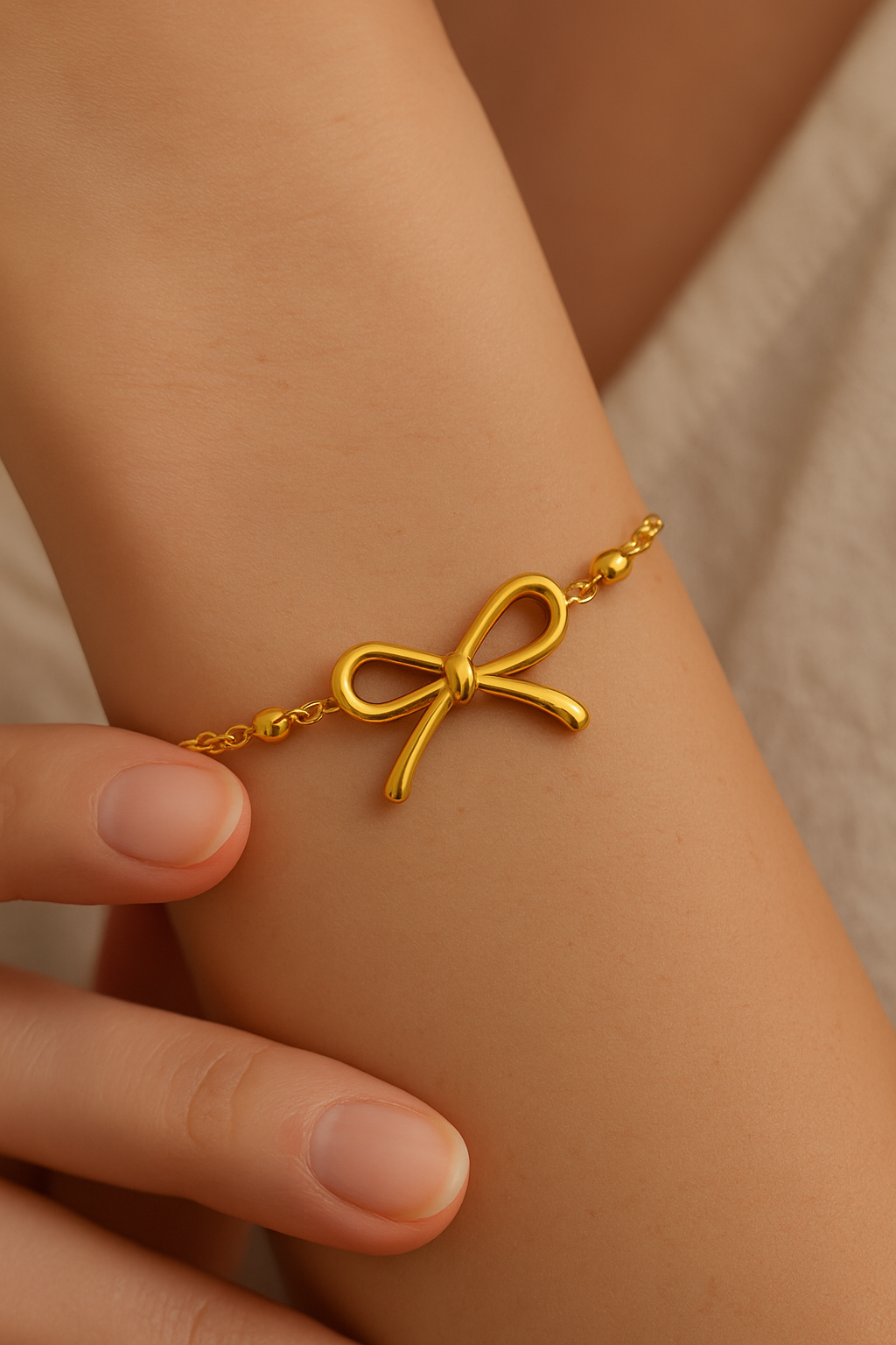 Delicate, graceful, and undeniably charming—the Golden Bow Charm Bracelet is a sweet symbol of elegance and femininity. Crafted with a sleek gold-plated bow centerpiece on a dainty chain, this piece adds a refined yet playful touch to any wrist. A perfect everyday accessory or thoughtful gift.