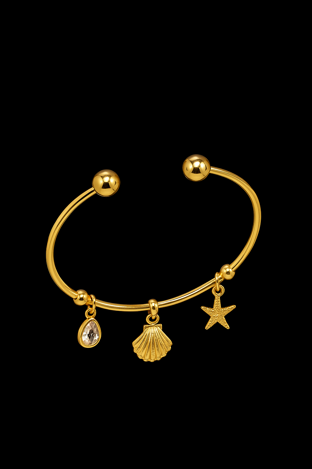 Channel beachy elegance with SeaWhispers—a radiant gold bangle adorned with ocean-inspired charms including a sparkling droplet, a scallop shell, and a starfish. Perfect for those who carry a piece of the sea wherever they go.