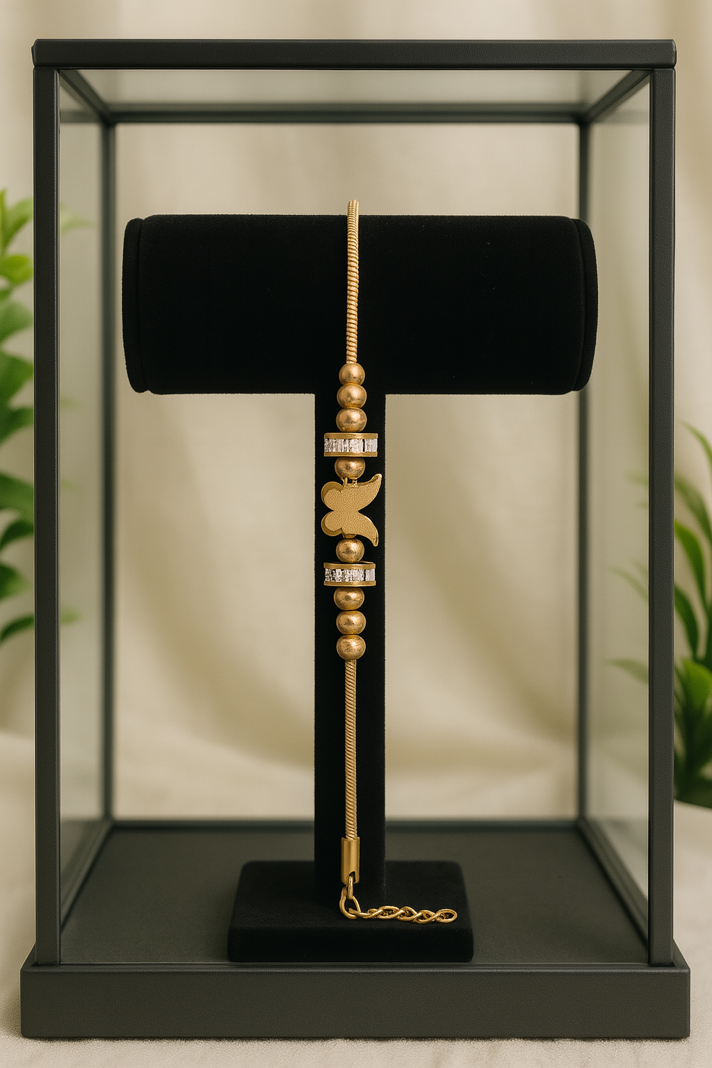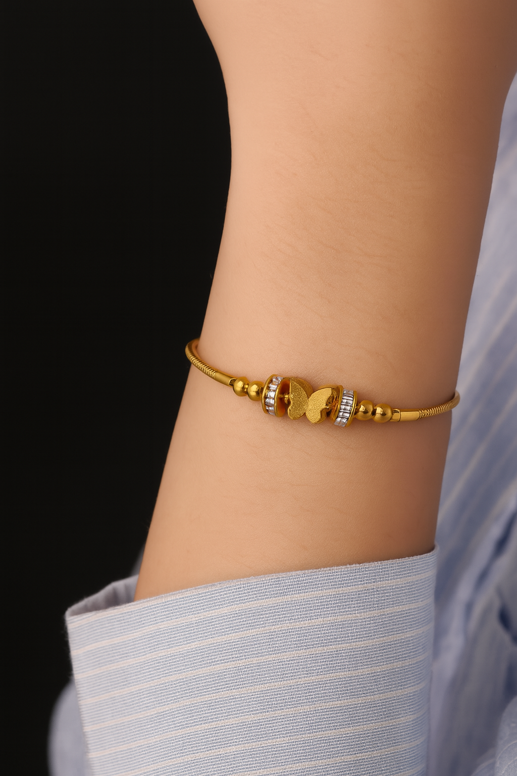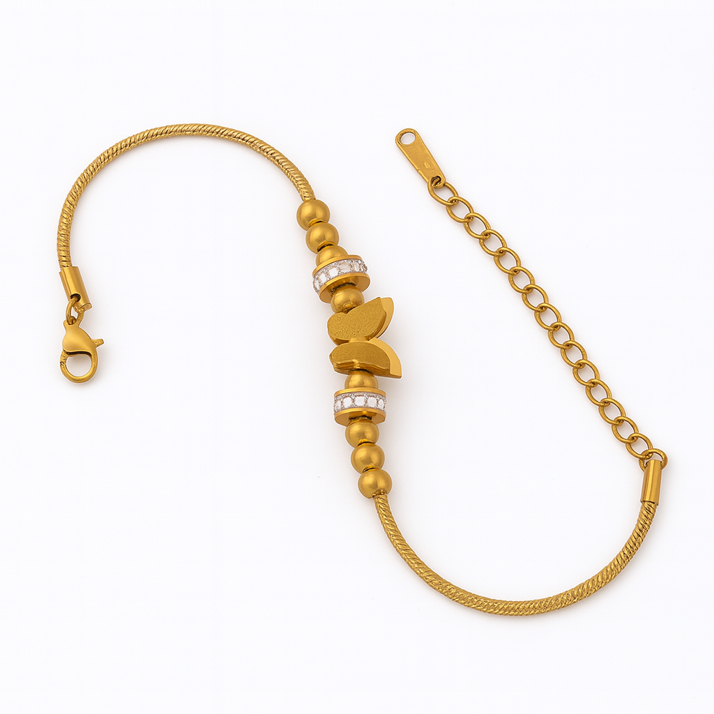 Make a bold yet graceful statement with ButterBold—a stunning gold-plated bracelet featuring butterfly charms, radiant crystal-studded rings, and polished bead accents. It’s elegance in motion, with just the right sparkle.