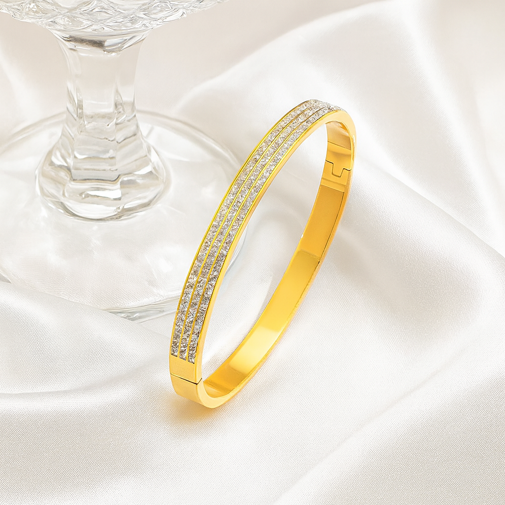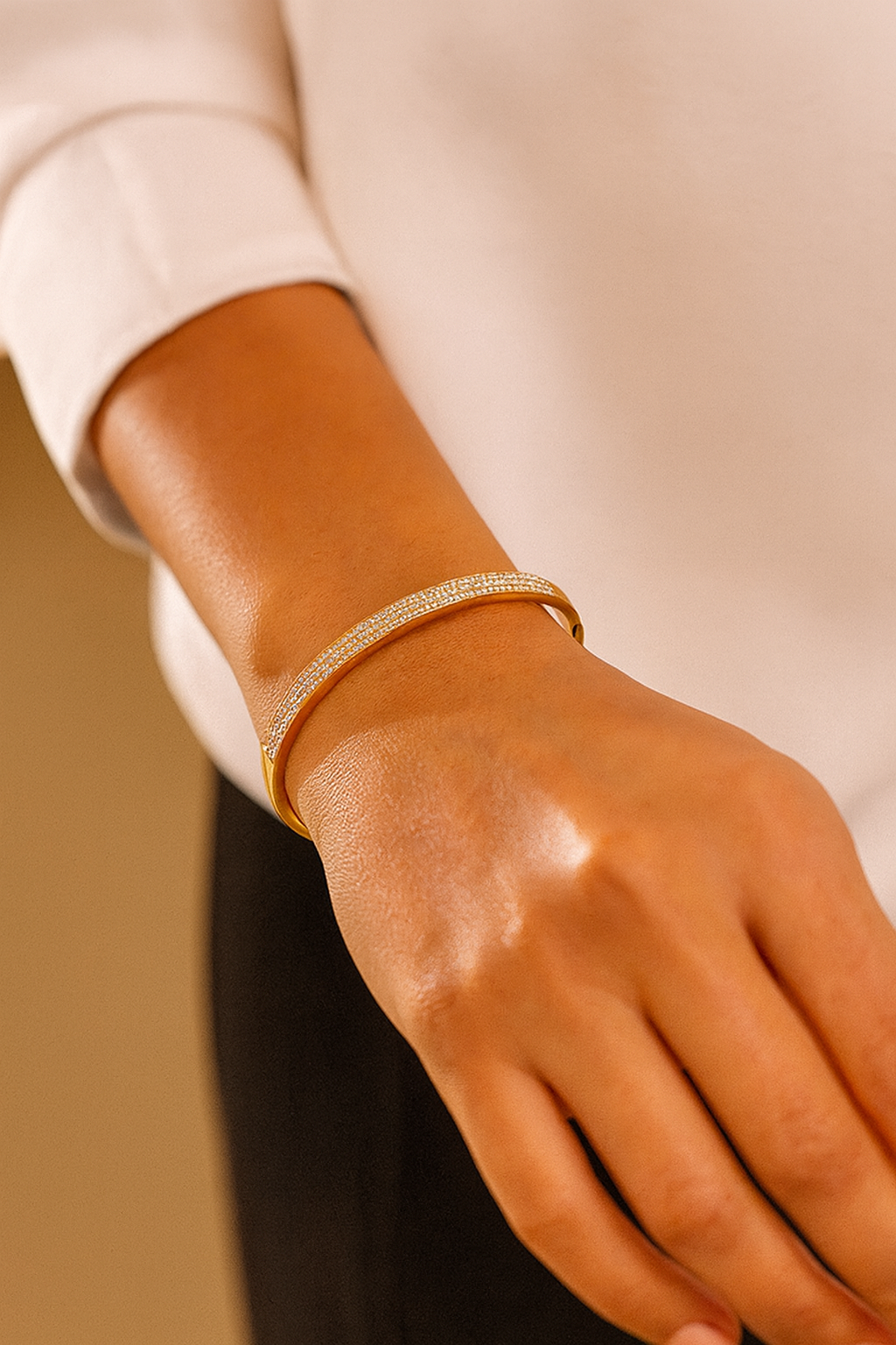 Celestia – A dazzling openable bangle crafted in stainless steel with 18K gold plating and encrusted with AD stones. Anti-tarnish, waterproof, and made to shine as bright as you. ✨