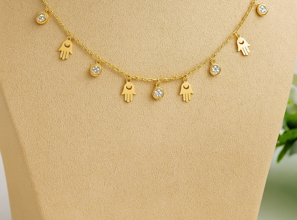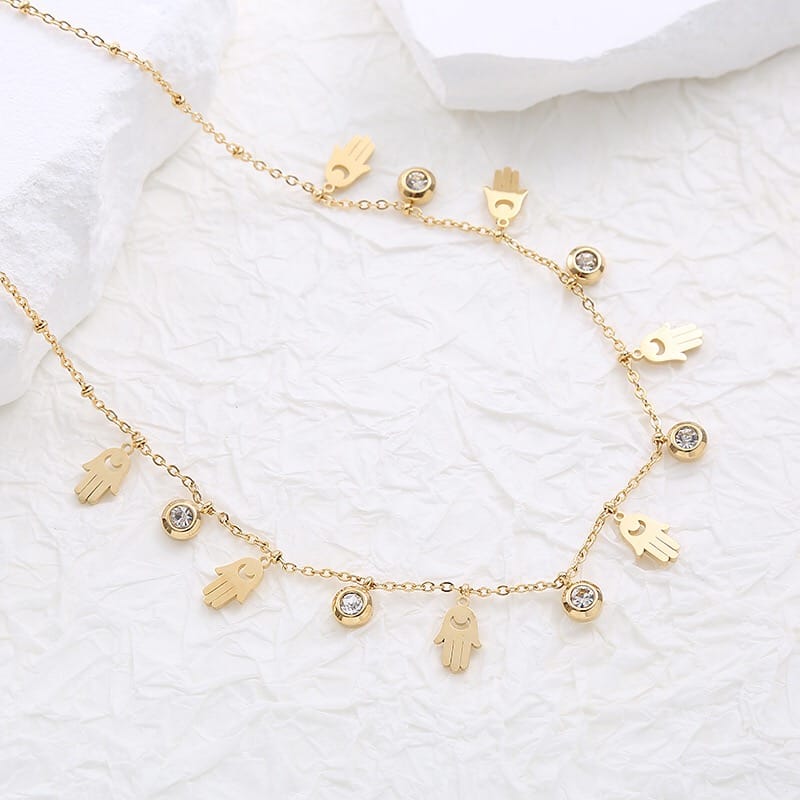 Elevate your everyday look with this elegant stainless steel necklace featuring dainty Hamsa hand charms and shimmering CZ stones. Crafted with a durable anti-tarnish gold finish, this piece blends spirituality and sparkle for a timeless, versatile accessory that resists wear and keeps its shine.