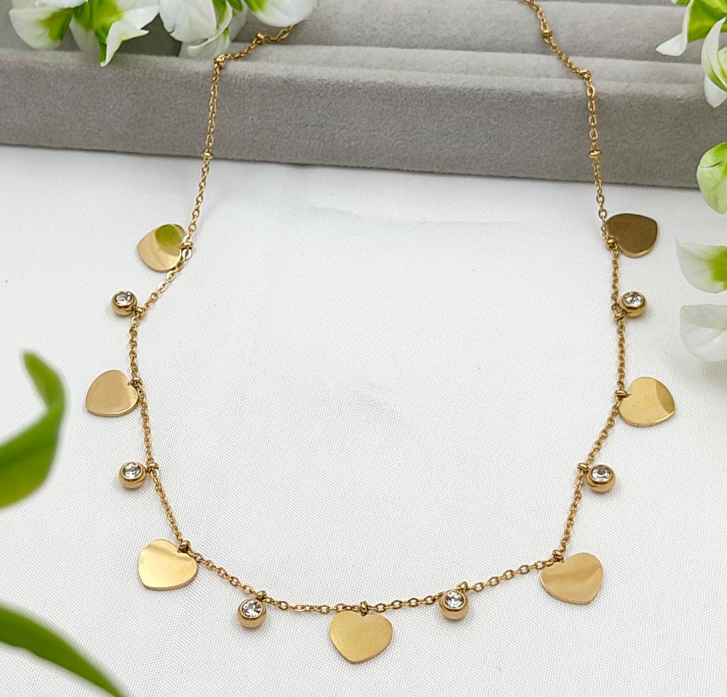Add a romantic charm to your everyday style with this stainless steel anti-tarnish heart necklace. Featuring glossy gold-plated hearts and sparkling CZ drops, this necklace is waterproof, hypoallergenic, and designed to shine through every season—perfect for layering or wearing solo.