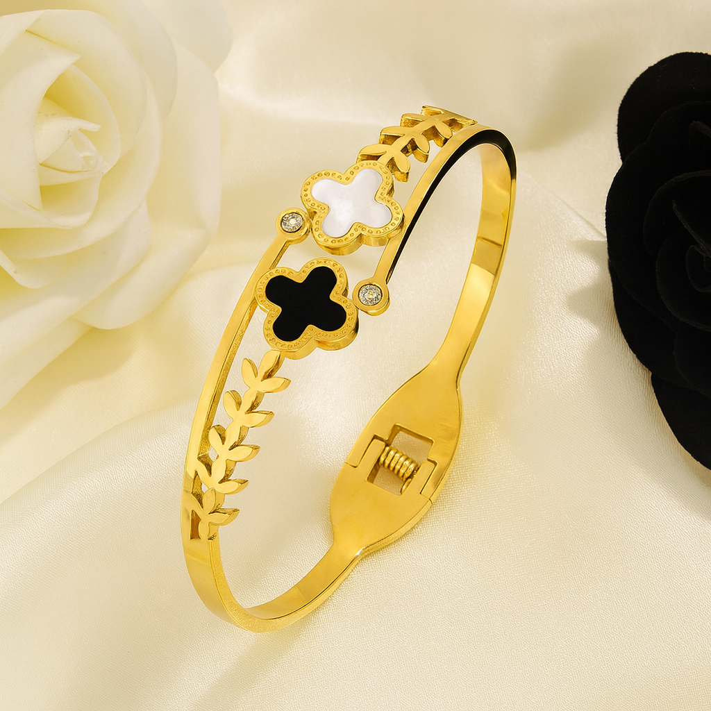 A gold-plated stainless steel bangle featuring twin clover charms in black enamel and luminous mother of pearl, accented with delicate leafy details. Anti-tarnish, waterproof, and crafted to bring luck and grace to every look.