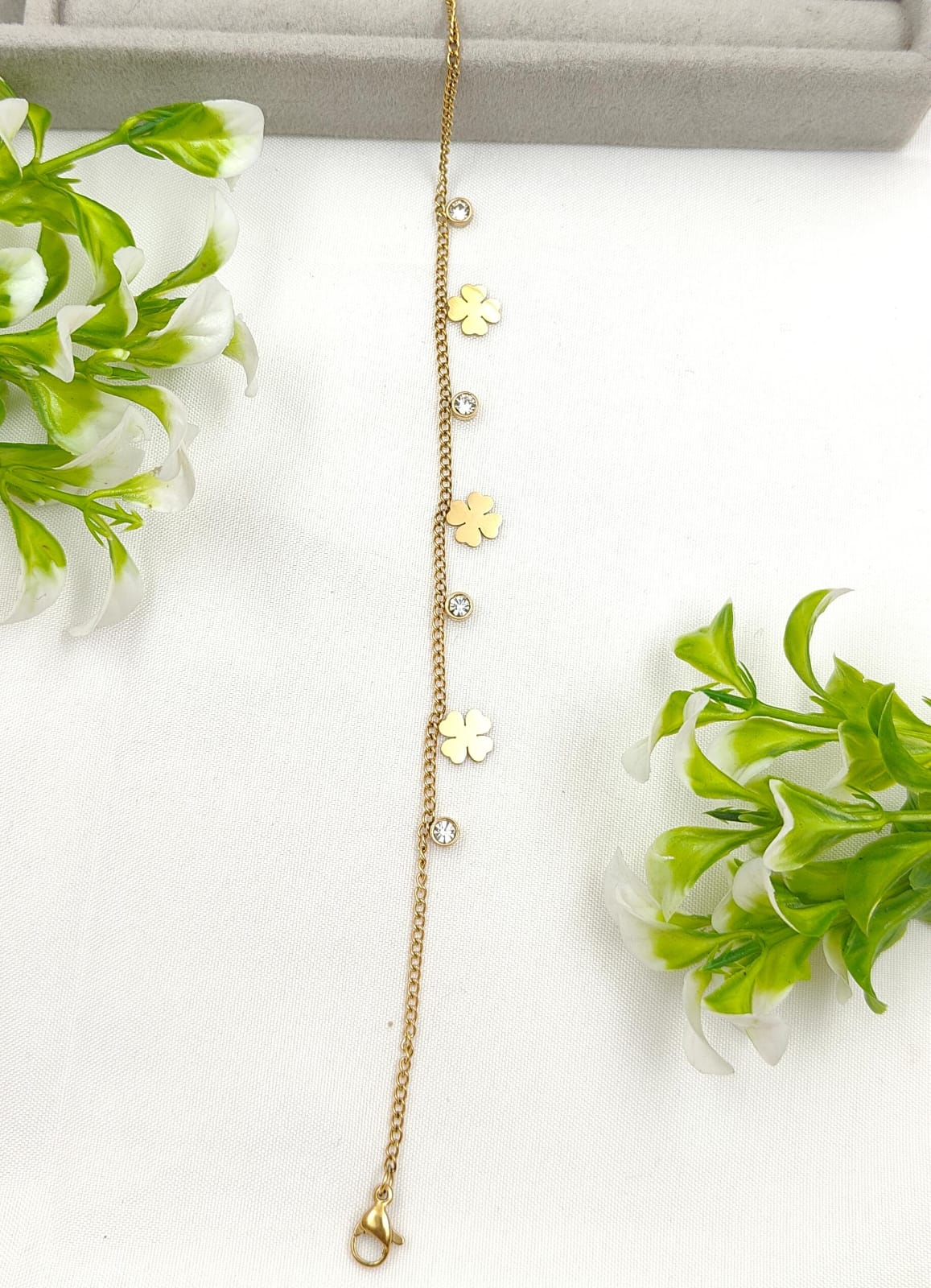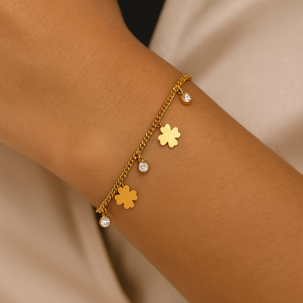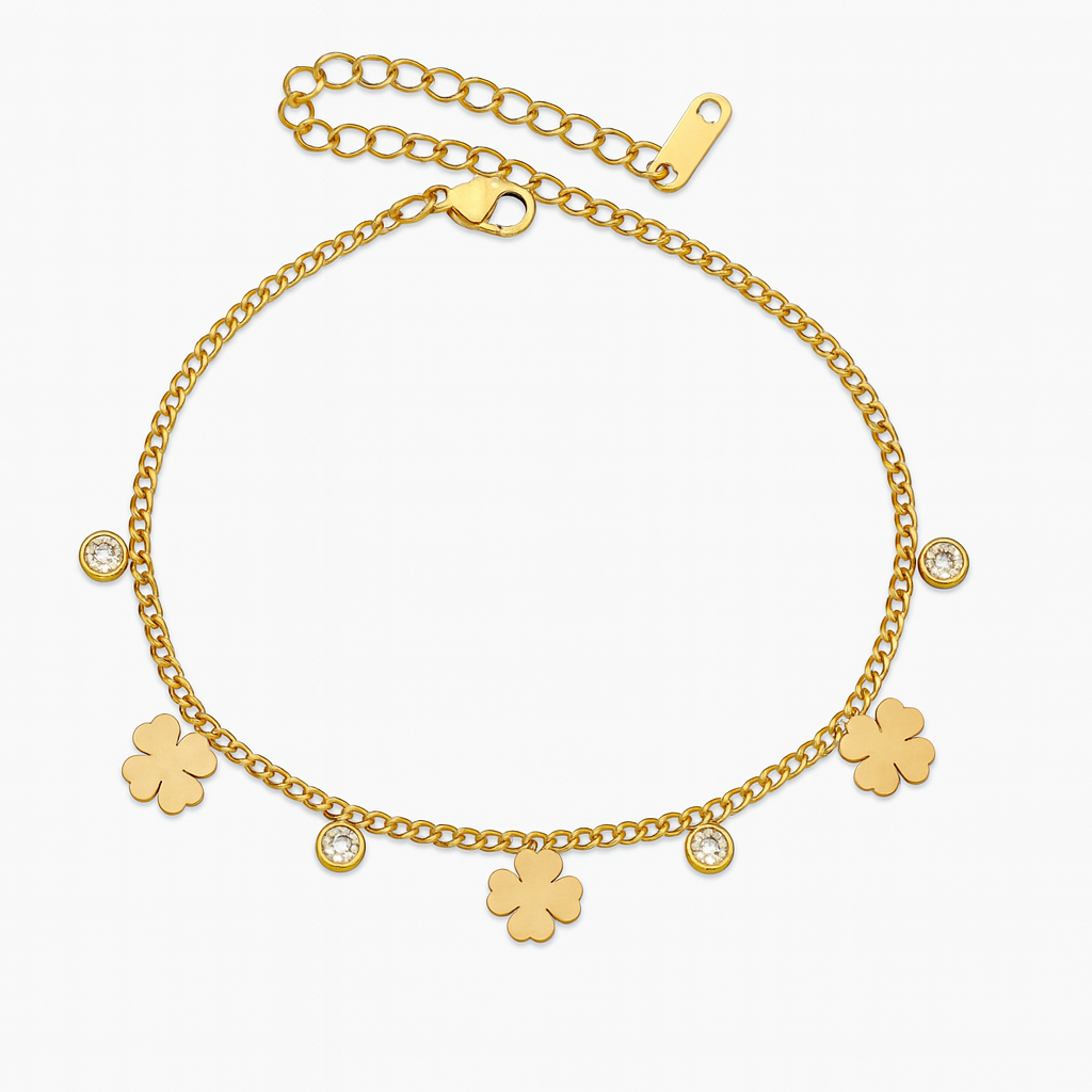 Delicate yet dazzling, the CloverTwinkle Bracelet features dainty four-leaf clover charms and twinkling crystal accents, making it the perfect symbol of luck, elegance, and everyday charm. A must-have for those who adore minimalist gold jewelry with a hint of sparkle.
