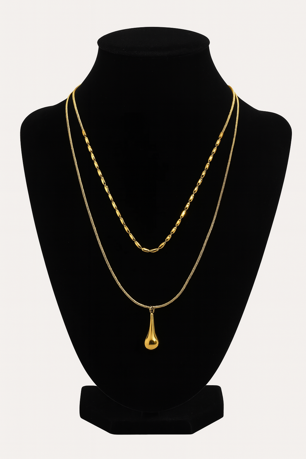 Modern, minimal, and made to shine—Dew Drop Duo is a sleek layered necklace featuring a smooth snake chain and a bold teardrop charm paired with a glossy bead chain. Wear it solo for subtle drama or layer it up for statement chic. Your golden hour just got trendier!