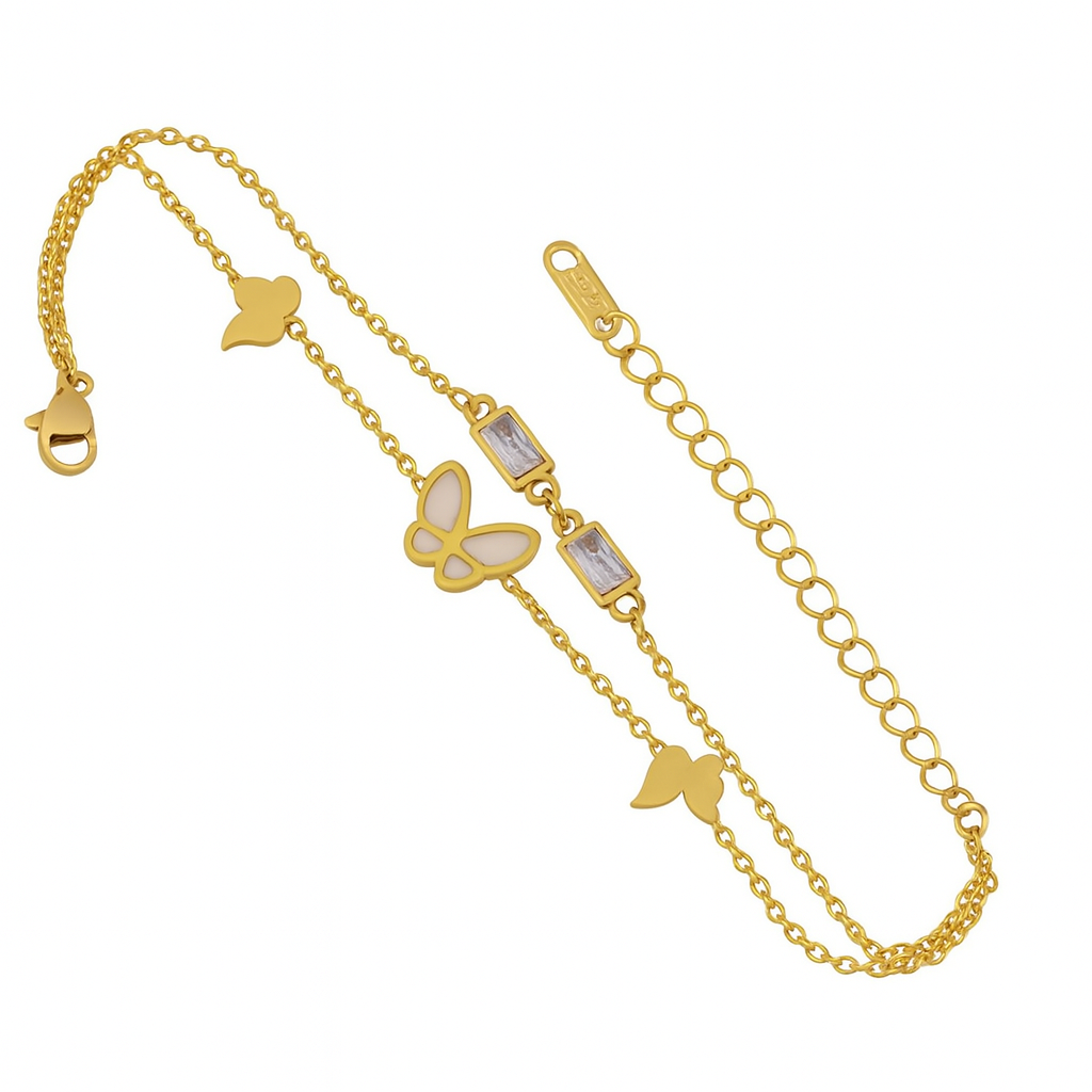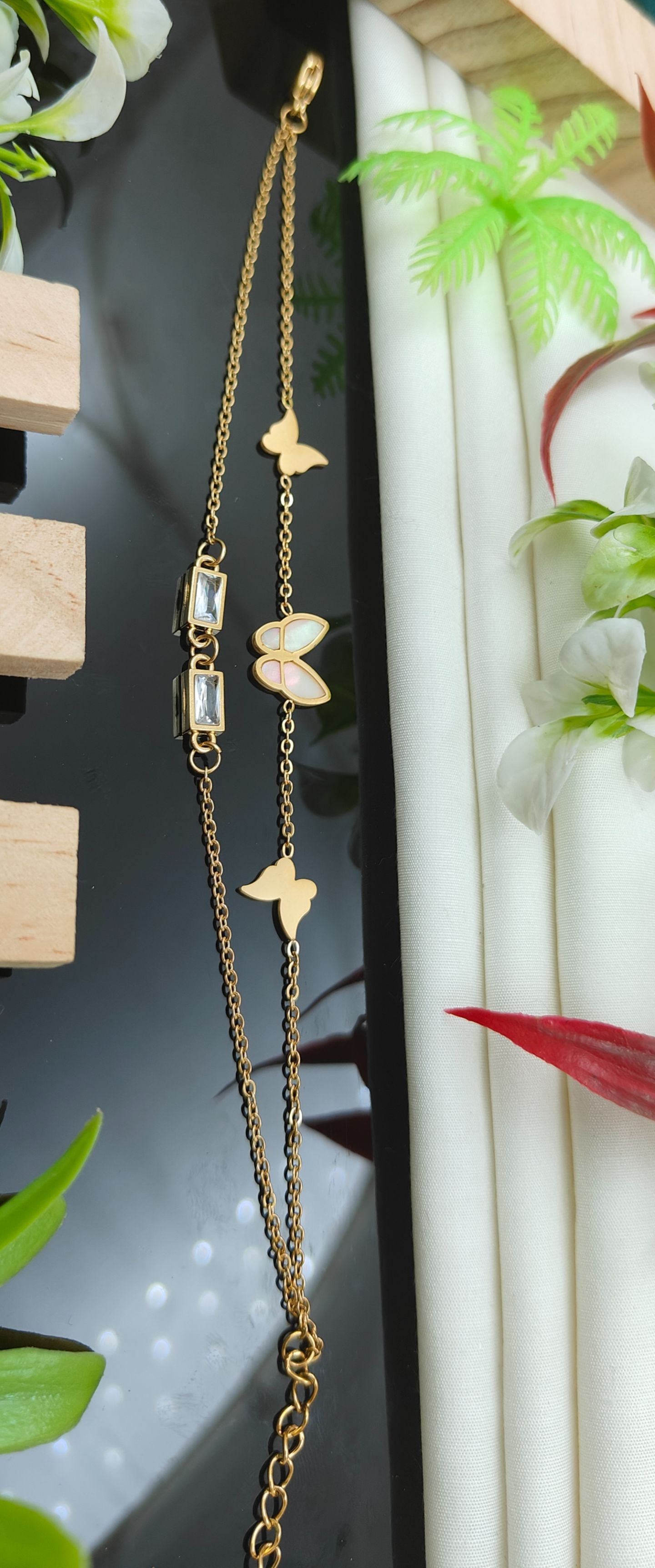 Delicate, dreamy, and full of charm—FlutterGlow is your wrist’s new best friend. This dual-chain gold-plated bracelet features a dainty butterfly charm, twinkling crystal baguettes, and tiny winged accents, making it perfect for everyday magic.
