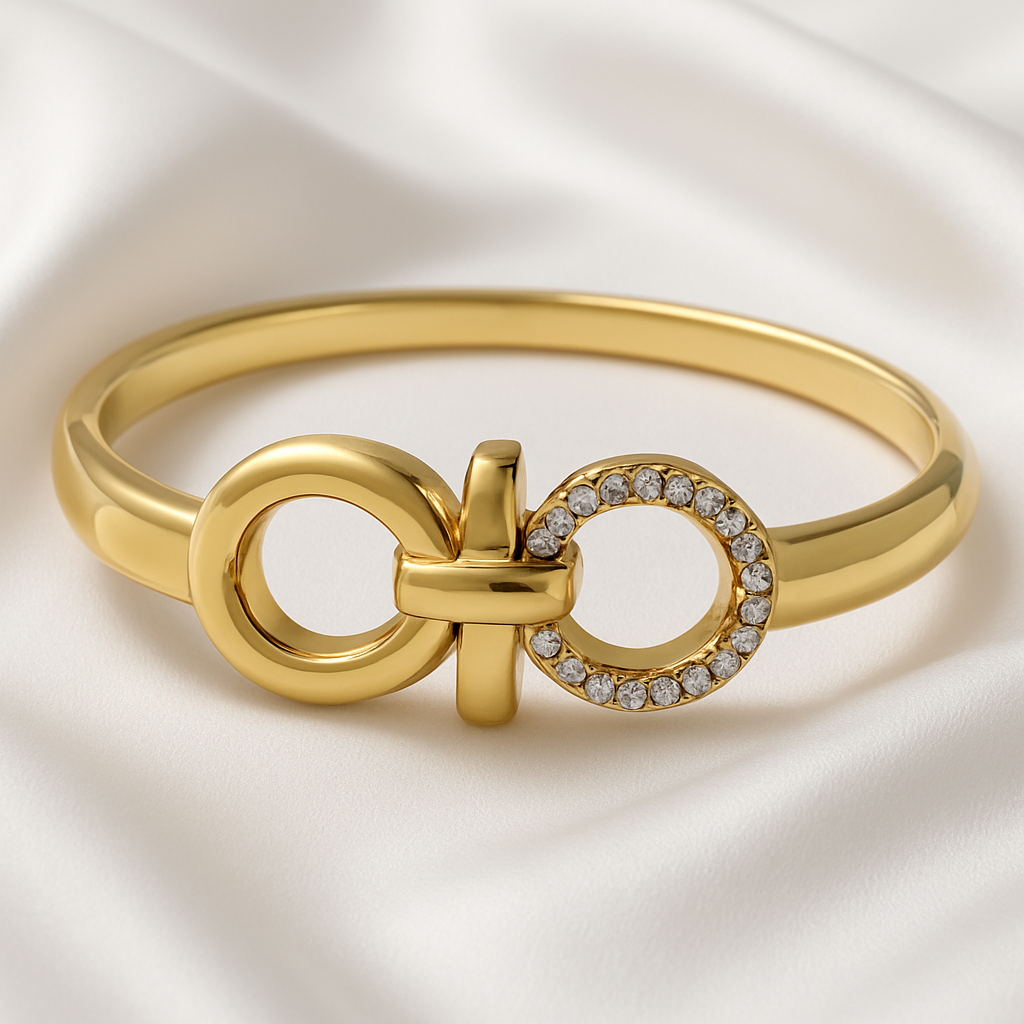 Elevate your wrist game with the EternaLoop Kada – a stunning openable bangle that marries modern elegance with timeless sparkle. Featuring a unique interlocking design in polished gold and crystal accents, this piece offers both style and comfort for any occasion.