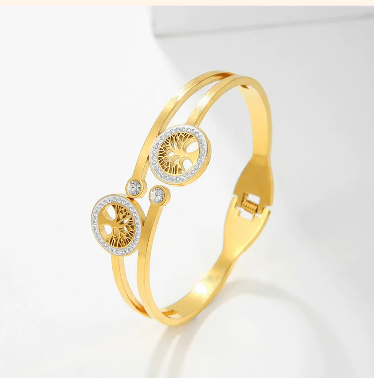 Crafted in a radiant gold finish with the Tree of Life motif at its heart, this anti-tarnish kada captures the beauty of growth, grounding, and grace. Its dual halo accents sparkle with quiet luxury, making it the perfect piece for women who stay rooted yet shine boldly.