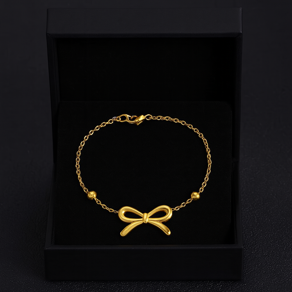 Elevate your elegance with the Golden Ribbon Charm Set, a stunning 4-piece jewelry ensemble featuring a necklace, bracelet, earrings, and adjustable ring—all adorned with dainty bow designs in radiant 18k gold PVD plating. Perfect for special occasions or gifting moments that matter.