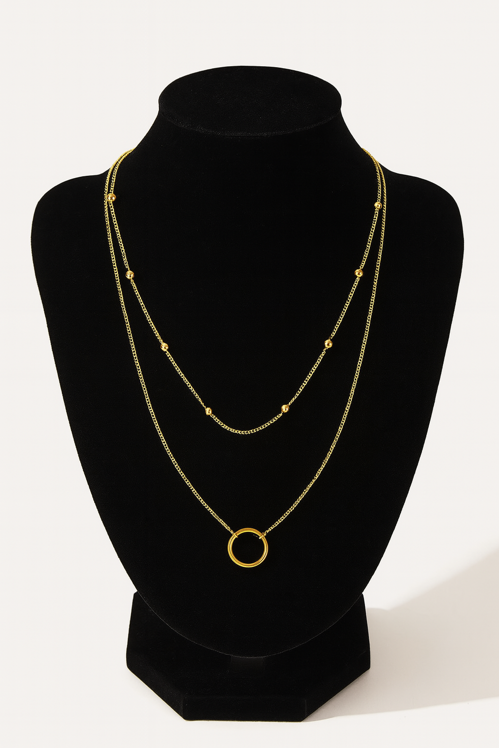 Layered Gold Necklace for Women – Features two delicate chains with a minimalist ring pendant and dainty gold beads for a trendy, layered look.