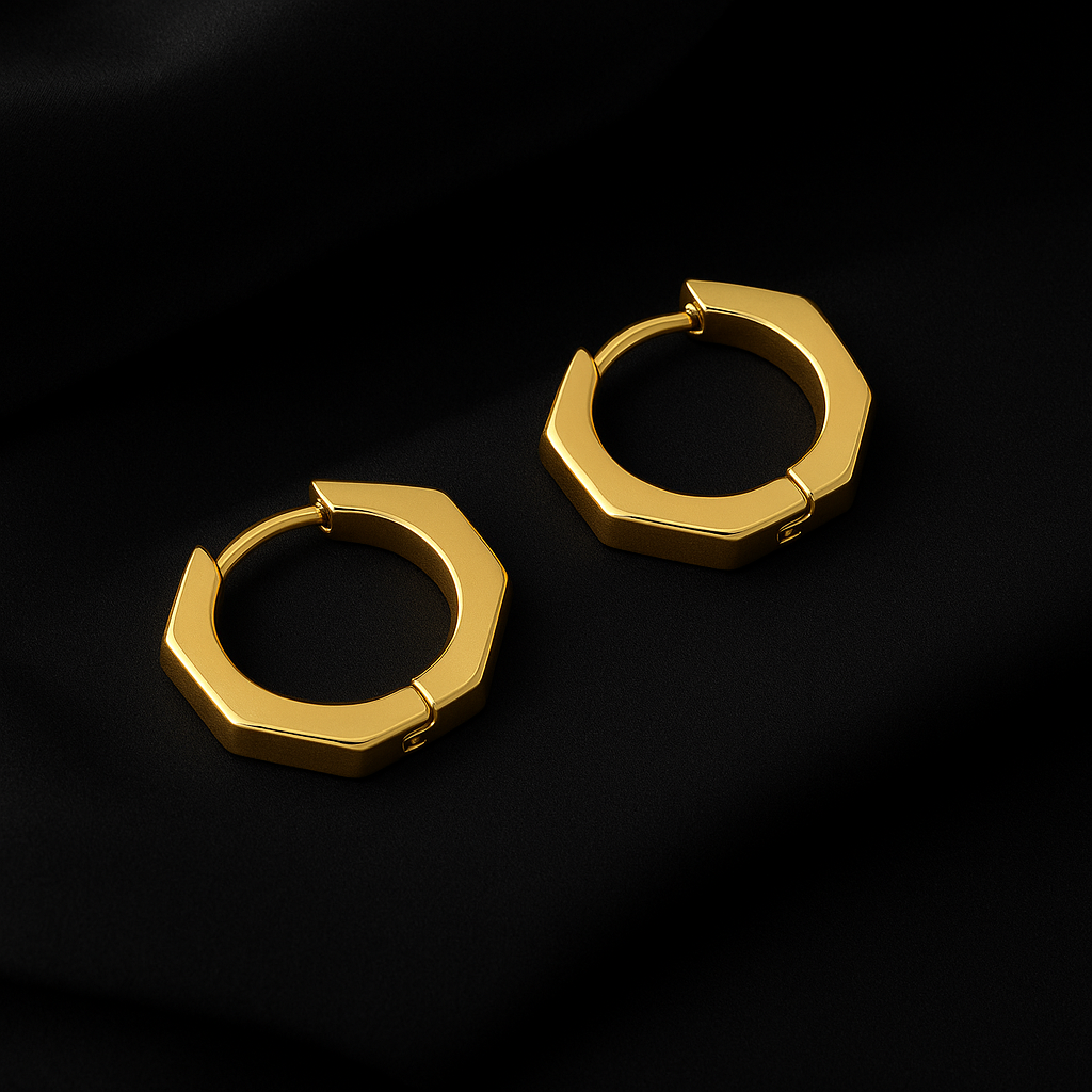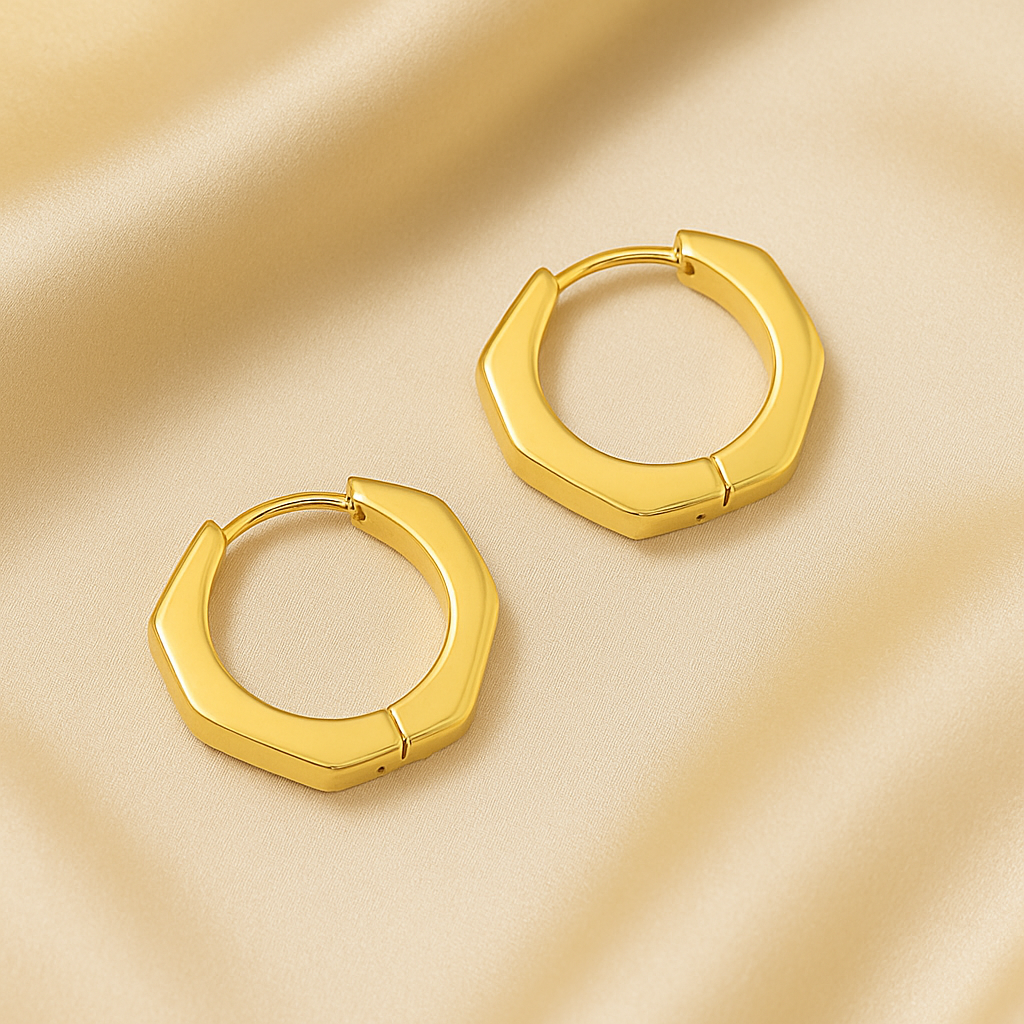 Bold meets refined in Edge Hoops—a modern twist on classic gold huggies. With their geometric silhouette and polished finish, these earrings bring structure and shine to any look, from casual to chic.