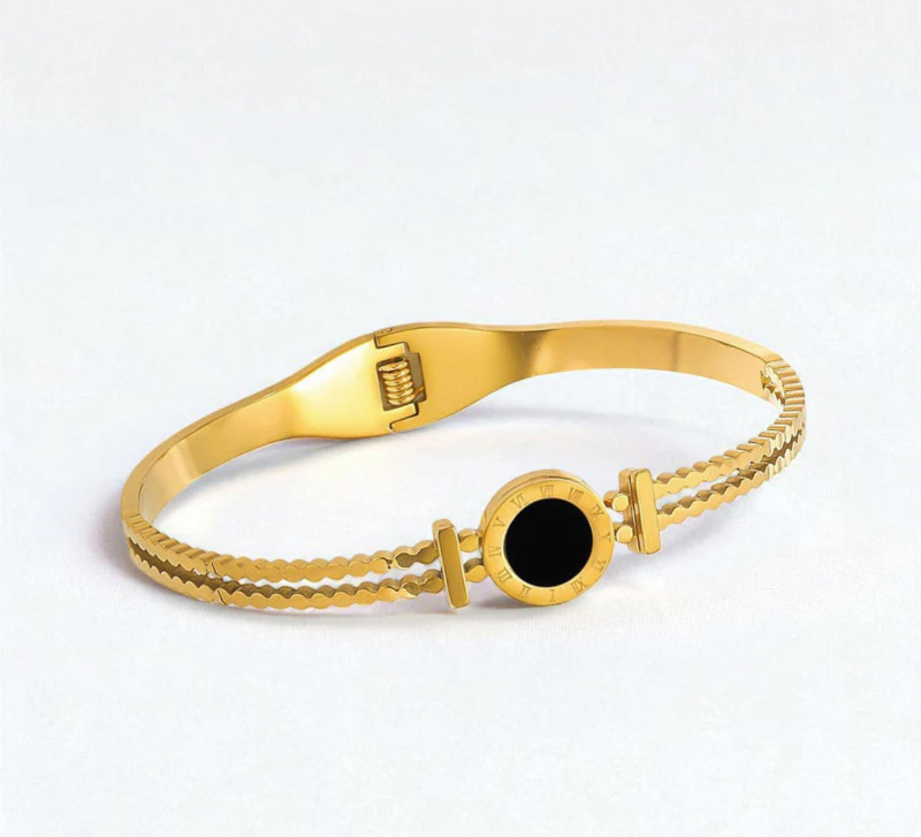 This anti-tarnish kada draws inspiration from the elegance of Roman numerals encircling a deep black core, framed in radiant gold. A statement of strength and poise, designed for the modern woman who carries her elegance effortlessly — every day, everywhere.