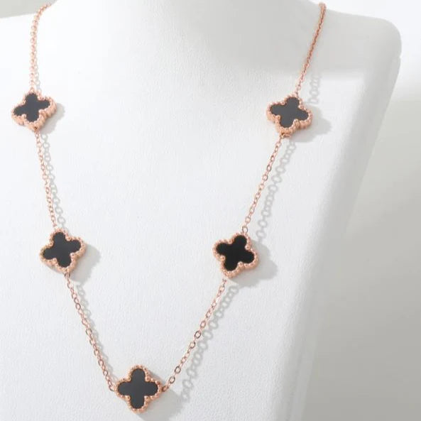 Make elegance your signature with this gold-toned stainless steel necklace featuring iconic black enamel four-leaf clover motifs. Finished with an anti-tarnish waterproof coating, this timeless piece effortlessly blends modern minimalism with lucky symbolism—perfect for day or night.