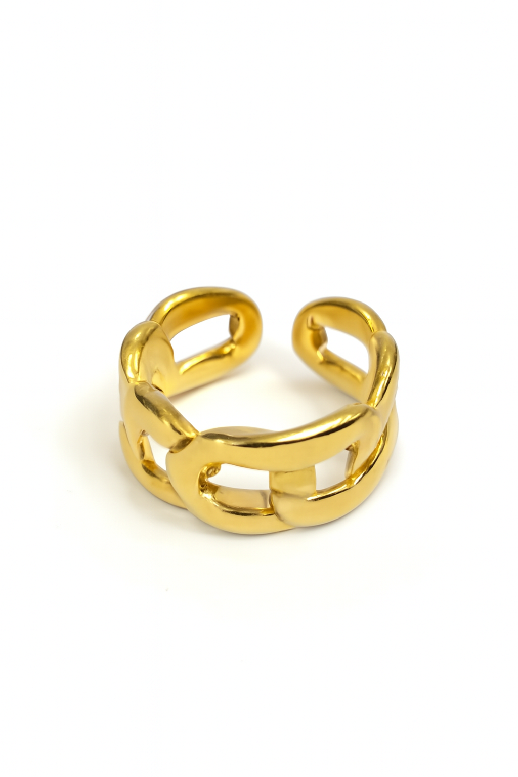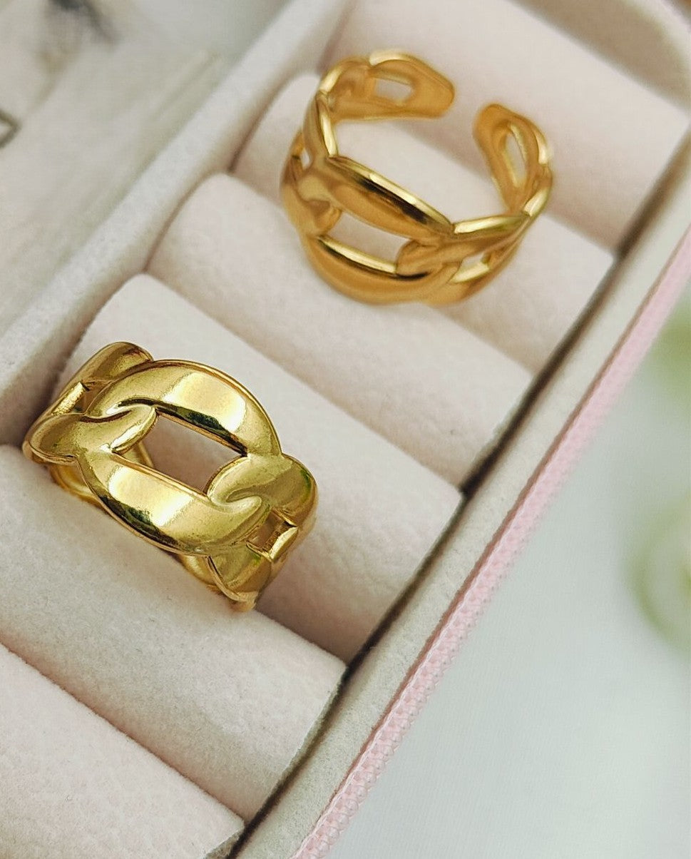 Bold, edgy, and effortlessly cool — the Chain Reaction Ring brings statement style to your fingertips. With its chunky gold chain-link design and adjustable open-back fit, this ring adds a fierce touch to any outfit.