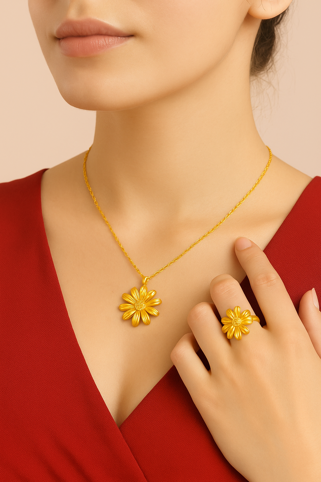 Bring a touch of sunshine to your style with the Golden Bloom Set. Featuring a radiant sunflower-inspired pendant necklace and a matching statement ring, this set is crafted in 18K gold plating with intricate petal detailing and a textured floral center. Perfect for gifting or adding a cheerful glow to your own jewelry collection, this set blends nature's charm with everyday elegance.