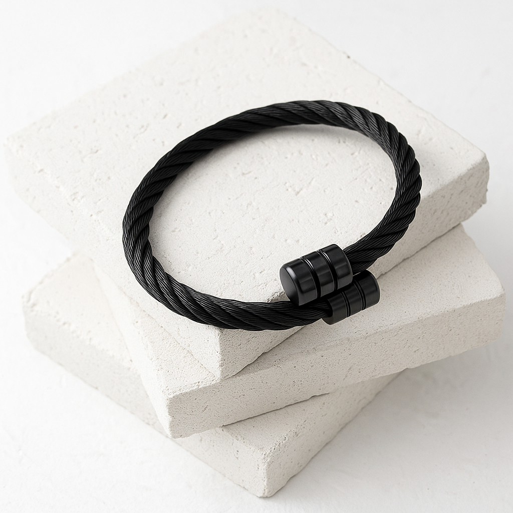 The Titan Twist is a bold black silver-plated men’s bracelet designed with a twisted cable style that symbolizes power and resilience. Anti-tarnish and built to last, it’s the perfect accessory for men who want effortless strength with modern sophistication.