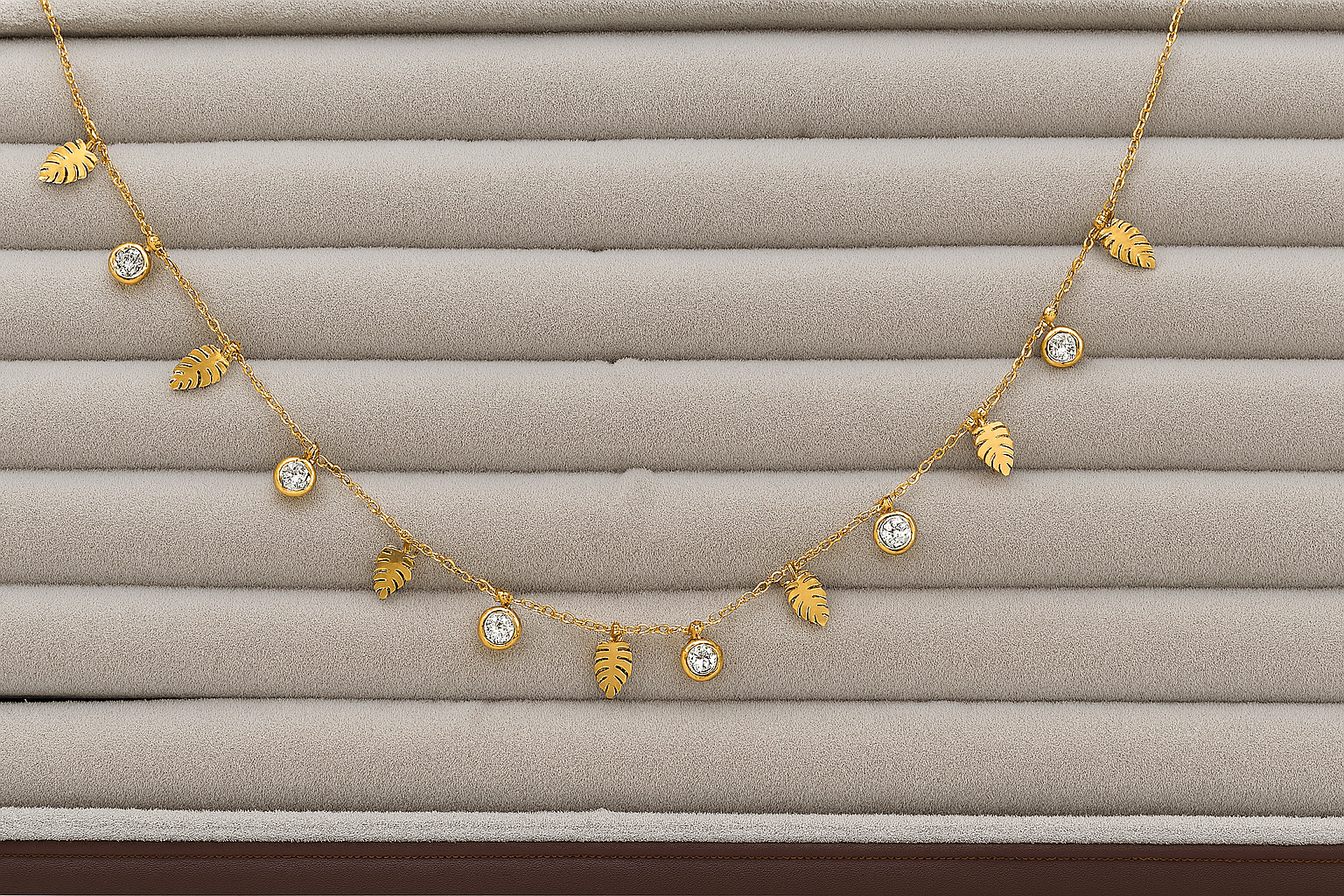 Delicate yet striking, this Tropical Gleam Leaf Charm Necklace features alternating gold-toned palm leaf charms and shimmering cubic zirconia stones on a dainty chain. Perfect for daily wear, this piece adds a breezy, nature-inspired elegance to any look.