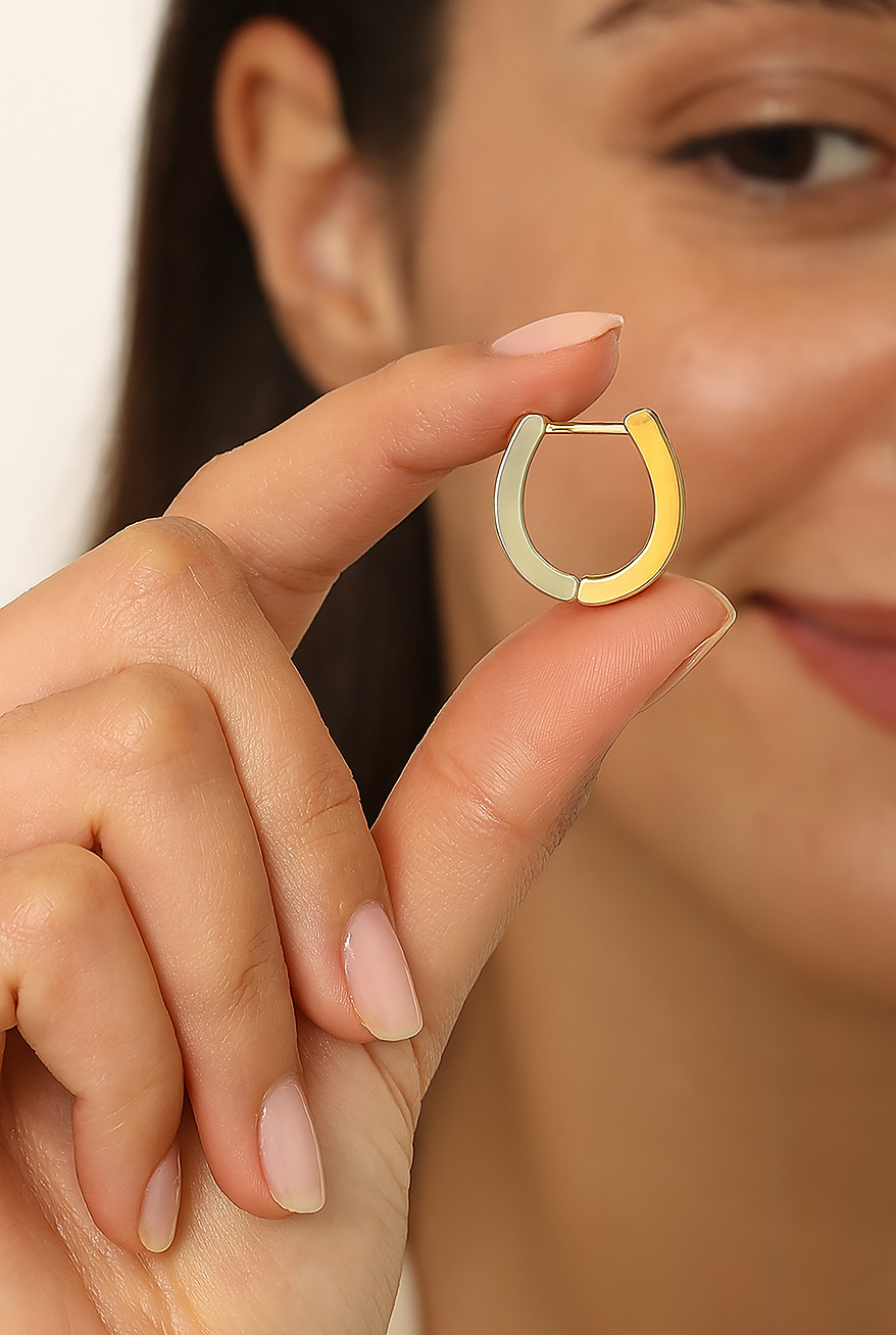 Meet DuoGlow Hoops—a sleek fusion of gold and silver tones that brings contemporary flair to your everyday style. These horseshoe-inspired huggies are equal parts bold and versatile, making them a must-have for modern minimalists.