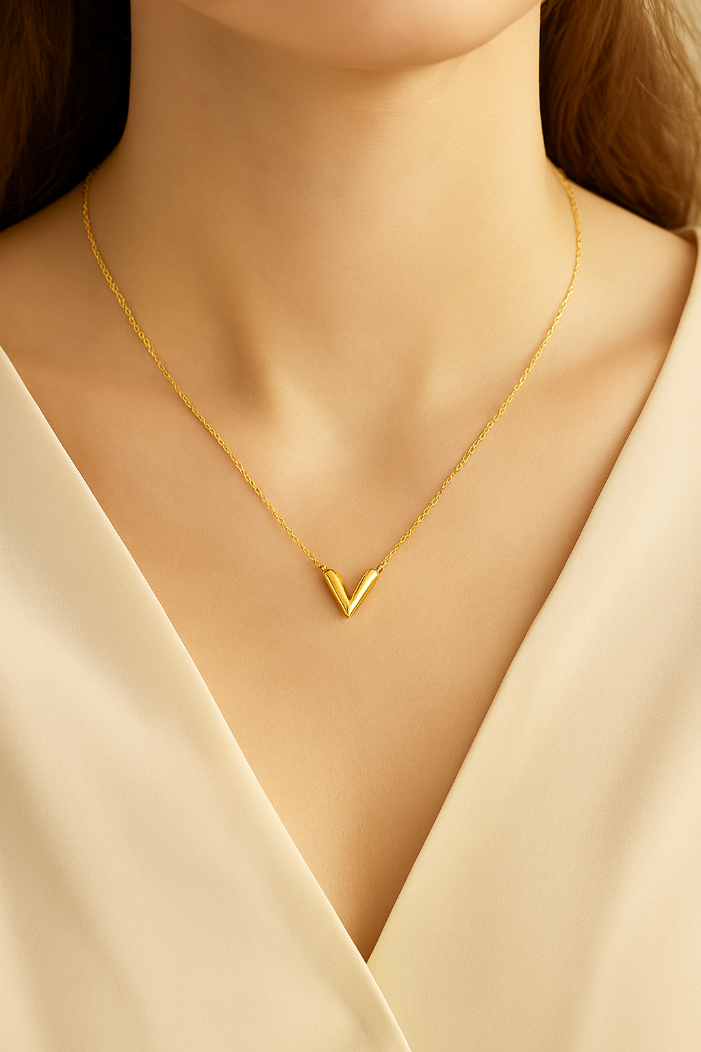 Elevate your everyday elegance with the Victory Charm Necklace – a sleek gold-plated V-shaped pendant that symbolizes strength and triumph. Minimalist yet striking, this necklace is crafted in durable stainless steel with a brilliant, tarnish-resistant gold finish, perfect for layering or wearing solo.