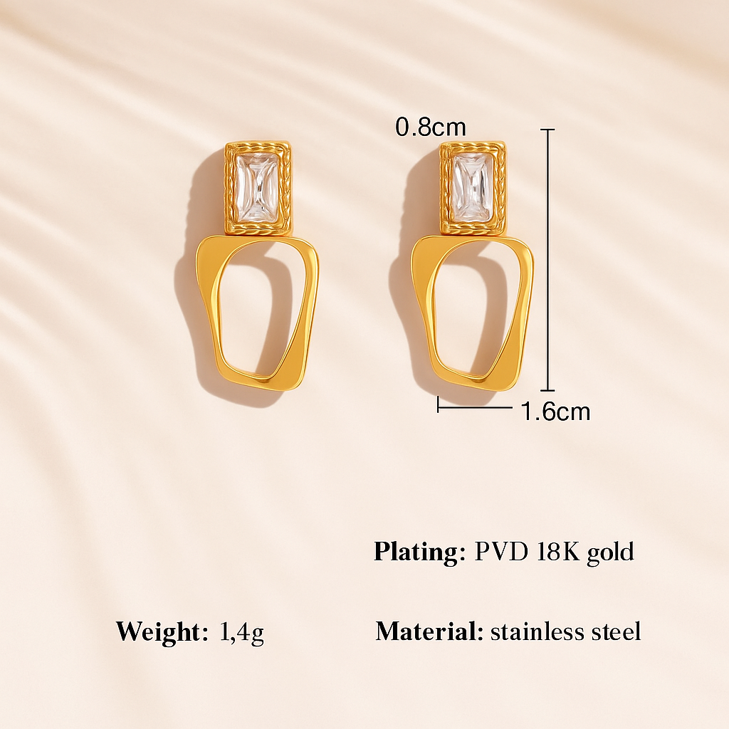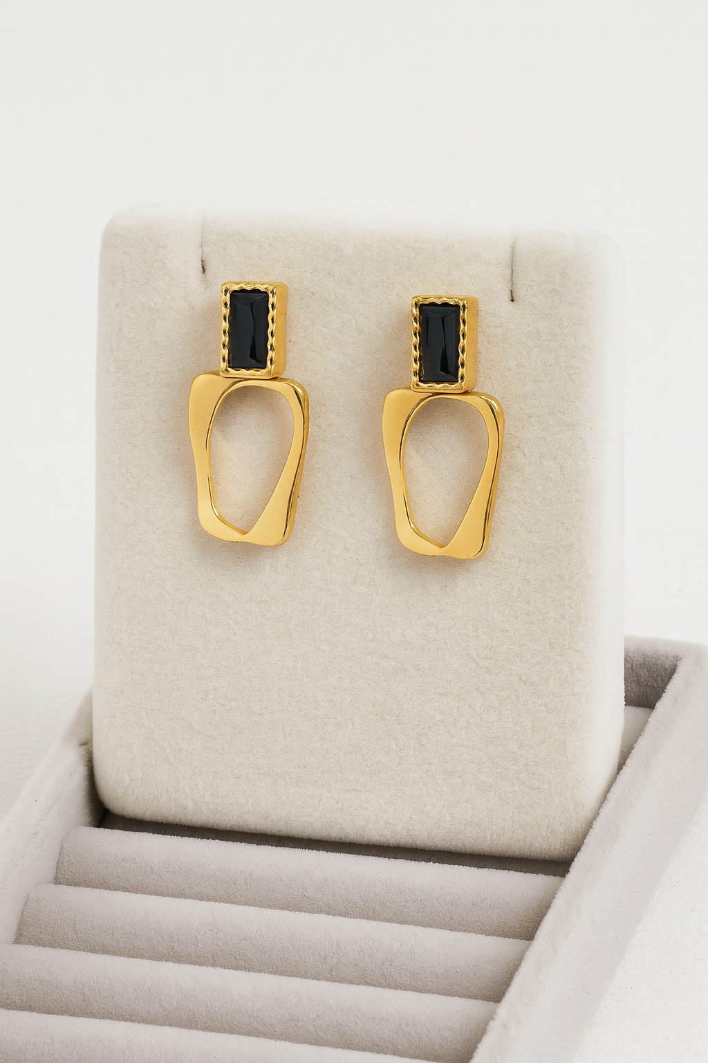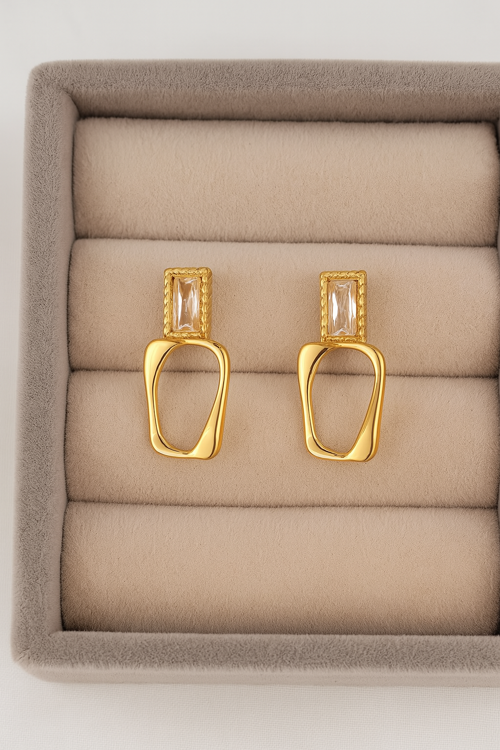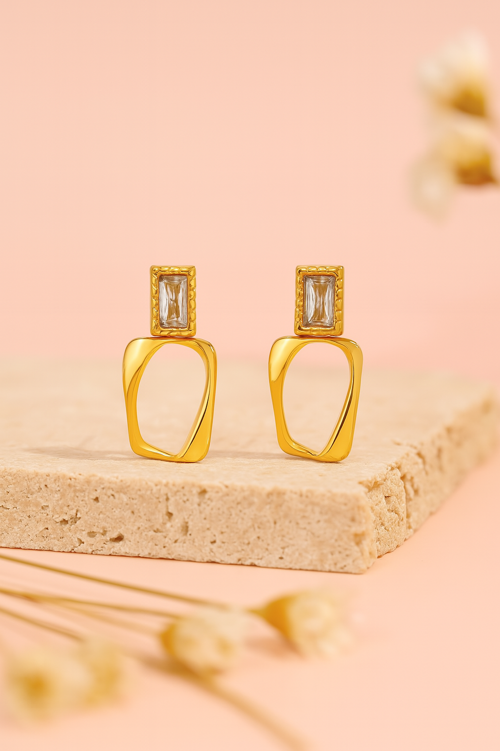 Modern elegance meets architectural charm in Gilded Prism. These geometric drop earrings feature a faceted baguette crystal top with an abstract gold open frame—designed to make a subtle yet unforgettable statement.